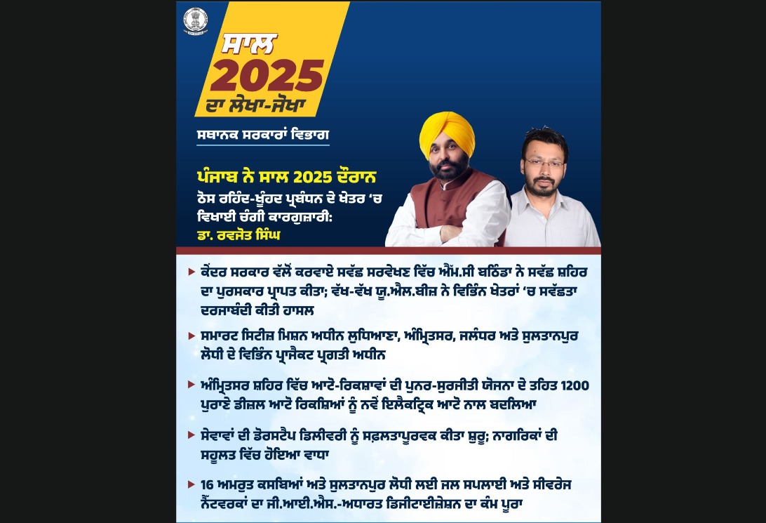 The Mann government’s “Rangla Punjab” is now also “Swachh Punjab”: it has been included among the top states in the country. Punjab has shown exceptional performance in the field of solid waste management during the year 2025. Municipal Corporation Bathinda has received the Swachh Shahar Award in the Swachh Survekshan conducted by the Ministry of … Read more