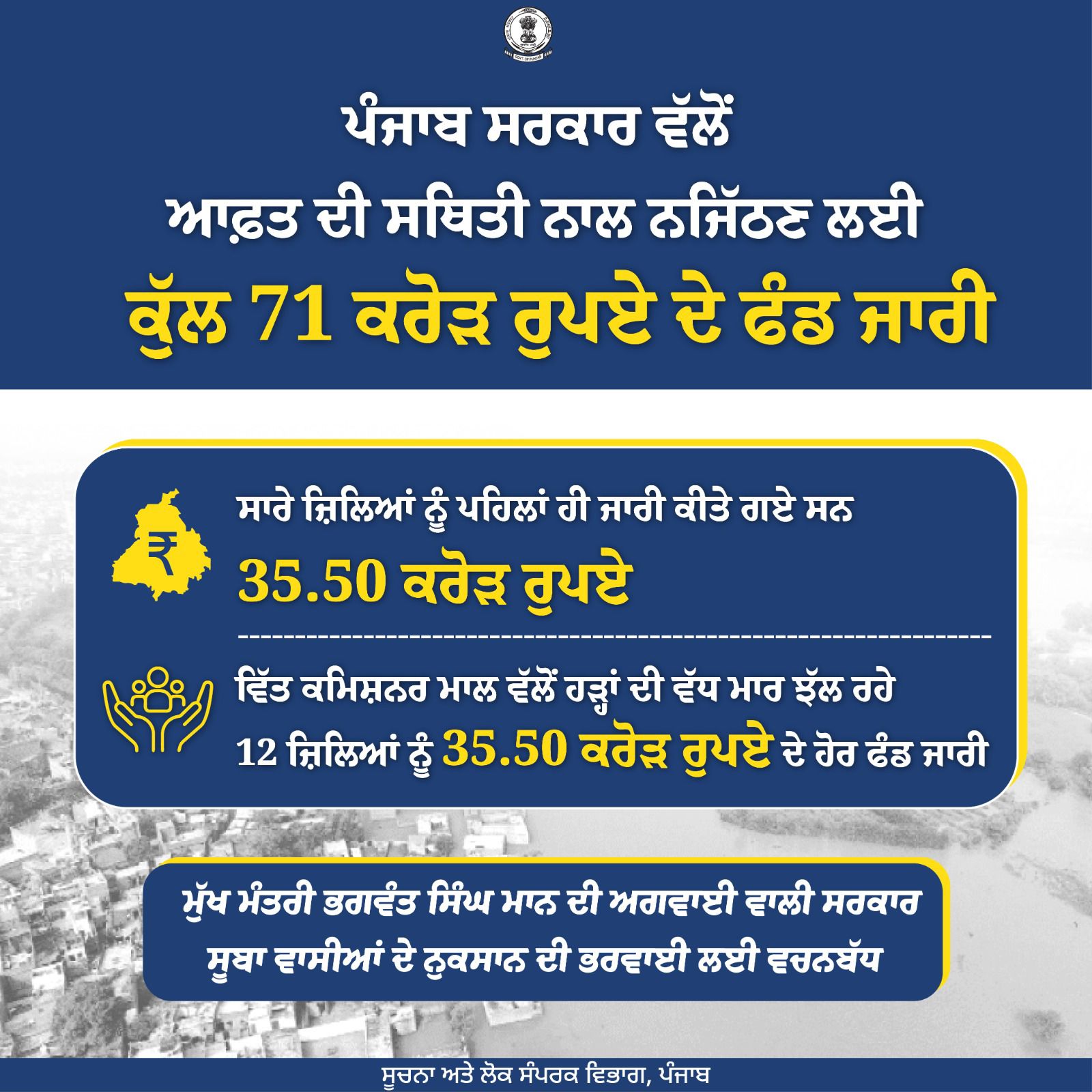PUNJAB GOVT RELEASES RS.71 CRORE FOR FLOOD RELIEF AND REHABILITATION AS IMMEDIATE MEASURE