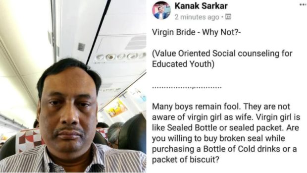 “Will you buy cold drink with broken seal?” Kolkata professor bats for virgin brides on FB. Then deletes post. Kanak Sarkar, a professor of Jadavpur University in Kolkata with 20 years of experience, said that a girl is sealed from birth biologically until someone opens it.